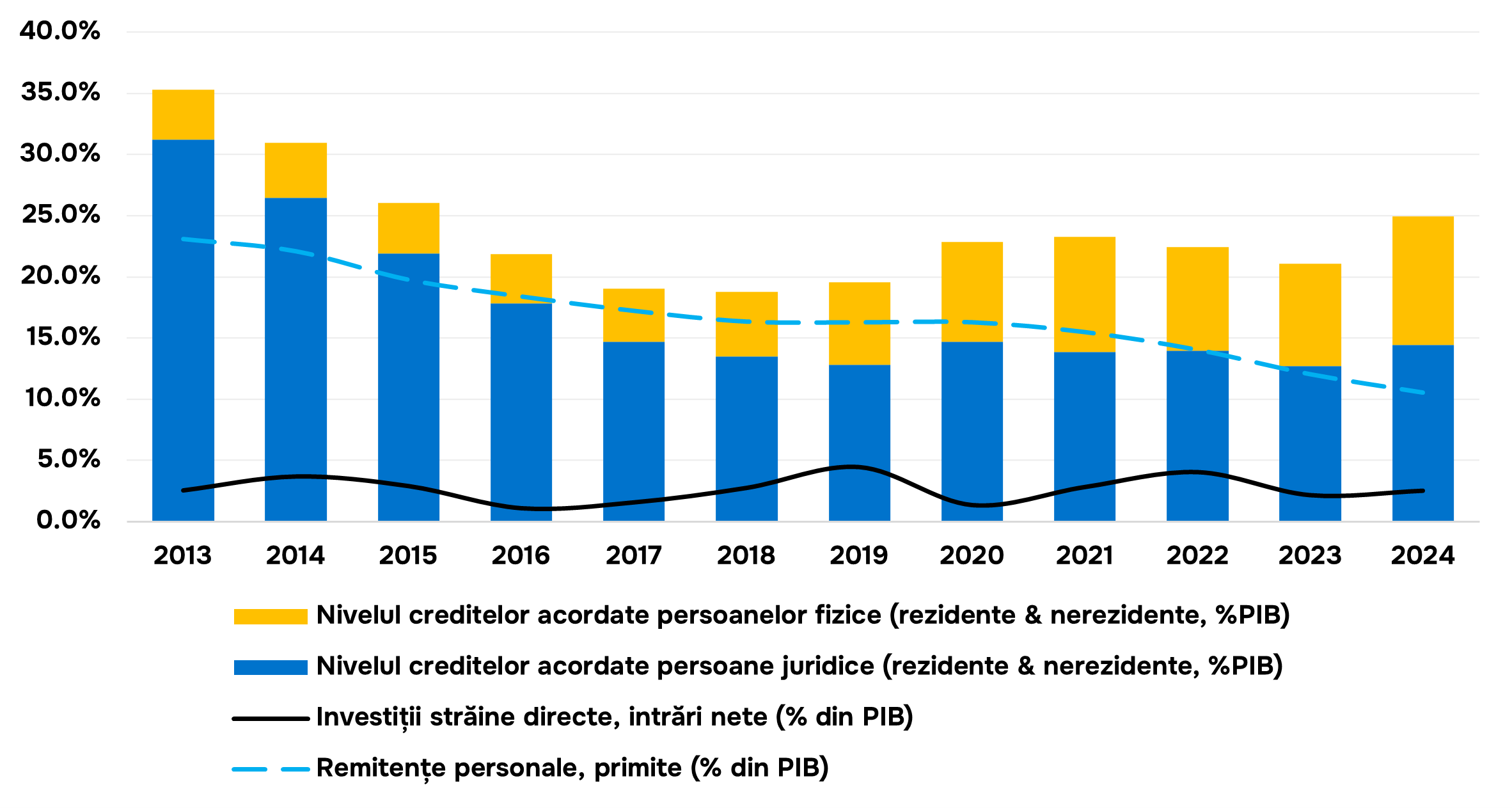 Băncile sunt primele instituții până la piața de capital care interacționează cu antreprenorii în etapele inițiale ale lansării unei afaceri. Iar, oferirea resurselor necesare pentru proiecte care într-adevăr pot crea valoare adăugată este un lucru care contribuie la creșterea economică și de oportunități indiferent de statul social. În Republica Moldova, finanțarea companiilor de către sectorul bancar din câte se poate observa din graficul de mai jos înregistrează un nivel din ce în ce mai mic pentru perioada analizată. Volumul creditelor acordate persoanelor juridice scăzând de la 31.2% din PIB în 2013 la 14.4% din PIB în 2024. În același timp, nivelul investițiilor străine directe a rămas la un nivel relativ constant. Desigur că, pe lângă creditele acordate de sectorul bancar ar trebui de analizat și activitatea OCN-urilor și a altor tipuri de instituții financiare nebancare precum fintech-uri e.g. Fagura, care oferă oportunități de finanțare pentru întreprinderi pe lângă sistemul bancar. Totuși, subiectul incluziunii financiare a întreprinderilor mici și mijlocii merită a fi expus într-un articol separat. Motiv pentru care, în cele ce urmează atenția articolului se va îndrepta către persoanele fizice. După cum se poate observa, din graficul de mai jos, nivelul de credite contractate de către acestea prin sistemul bancar a înregistrat o creștere de la 4.1% din PIB în 2013 la 10.5% din PIB în 2024. Mai mult, un lucru interesant este că această creștere a creditului contractat de persoanele fizice este însoțită și de scăderea remitențelor primite. Fapt ce confirmă observațiile literaturii de specialitate cu privire la excluderea voluntară din sistemul financiar a persoanelor care își finanțează nevoile din alte surse, dar și a faptului că remitențele primite nu mai pot fi de îndeajuns pentru acoperirea necesităților actuale.
