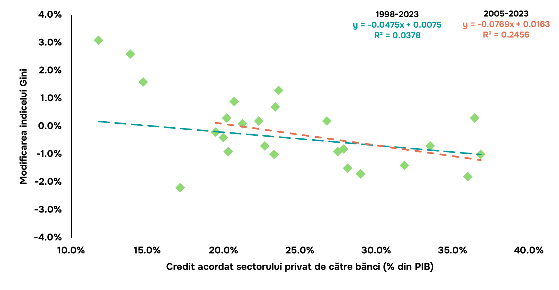 Pentru a înțelege importanța sistemului financiar Čihák et al. (2012, p.8)[iv] scot în evidență că acesta ”influențează cine poate începe o afacere și cine nu, cine poate plăti pentru educație și cine nu, cine poate încerca să își realizeze aspirațiile economice și cine nu.”. Mai mult, politicile care contribuie la îmbunătățirea alocării resurselor de către intermediarii financiari și la dezvoltarea sistemului în ansamblu contribuie la reducerea inegalităților sociale, inclusiv și la reducerea sărăciei prin oferirea oportunităților economice tuturor indiferent de statut social (Levine, 2004)[v]. Analizând acest fapt și în cazul Republicii Moldova, s-ar observa o relație negativă dintre modificarea indicelui Gini și creditul acordat sectorului privat de către bănci (% din PIB), conform graficului de mai jos. Cu alte cuvinte, o creștere a nivelului intermedierii financiare este corelată cu reducerea inegalităților sociale în Republica Moldova. Totuși, rezultatele acestui grafic sunt mai mult informative, deoarece prezența unei corelații nu indică cauzalitate și trebuie tratată cu prudență având în vedere natura de serie temporală a datelor, posibilul trend al variabilelor și lipsa unor variabile de control. Relația fiind robustă doar în perioada post-2005, sugerând o posibilă schimbare structurală în mecanismul de transmitere dintre intermediere financiară și inegalitate.