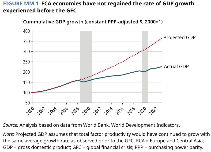 Accentul pus pe dezvoltarea sistemului financiar poate contribui la sporirea alocării mai eficiente a economiilor deja existente, către proiecte care într-adevăr contribuie la creșterea economică și a oportunităților în societate. Totuși, trebuie să avem în vedere faptul că, atunci când sistemul financiar acumulează vulnerabilități din asumarea excesivă de riscuri precum în criza financiară din 2008, acesta poate periclita creșterea economică și destabiliza economia. Conform Iacovone et al. (2025)[vi], dacă creșterea productivității totale a factorilor, regiunii Europei și Asiei Centrale după 2008 ar fi egalat ritmul de dinainte de criza financiară globală, produsul intern brut (PIB) al regiunii ar fi fost cu aproximativ 62% mai mare astăzi, după cum se poate observa în graficul de mai jos.