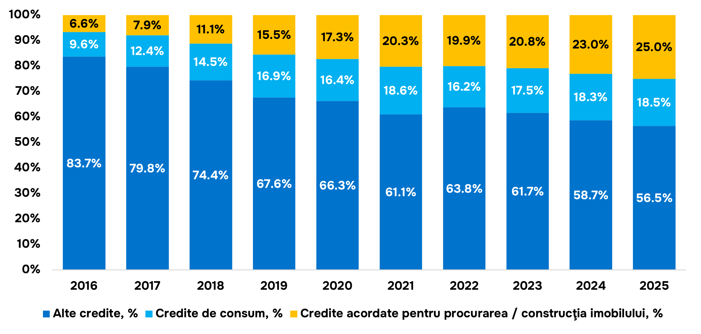 Mai mult, analizând structura creditelor acordate de sistemul bancar, prezentată în graficul de mai jos. Se poate observa că, expansiunea creditului în cazul persoanelor fizice este impulsionată atât de creditul pentru consum cât și de creditul pentru achiziționarea sau construcția unei locuințe. Acest fapt, sugerând că, investițiile gospodăriilor sunt concentrate în imobile, cu alte cuvinte acumularea de capital constă în active cu o productivitate redusă, motiv pentru care diversificarea oportunităților de investiții este extrem de importantă pentru canalizarea resurselor într-un mod în care să sporească creșterea economică.