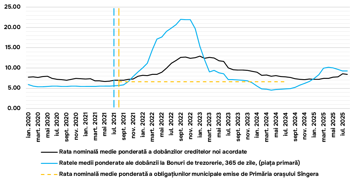 Studiul publicat de Expert-Group în 20247, sumarizând rezultatele primelor 3 emisiuni de obligațiuni din Republica Moldova, a demonstrat că folosirea acestor produse financiare este adeseori mai avantajoasă decât obținerea de împrumuturi bancare. Astfel, în 2022, dificultățile economice generate de războiul din Ucraina, de pandemia de Covid-19 și de criza energetică au cauzat creșterea bruscă a ratei inflației și, implicit, și a dobânzilor la credite. Astfel, localitățile Ceadîr-Lunga și Sîngera, oferind obligațiuni cu rată fixă, s-au împrumutat la dobânzi mult sub cele oferite de instituțiile bancare. Cazul municipiului Chișinău e mai complex, capitala împrumutându-se la o rată flotantă. Astfel, pentru Chișinău costul capitalului împrumutat a crescut simțitor de-a lungul anului 2022, ajungând la peste 20%, fapt ce a provocat îngrijorare cu privire la posibilitățile primăriei de a continua să-și onoreze obligațiile de plată. În schimb, în 2023 și în 2024 s-a înregistrat o scădere accentuată a ratei dobânzii, până la aproximativ 6%, o situație mult mai avantajoasă decât scenariul implicând împrumuturi bancare.