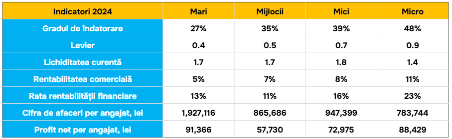 Lichiditatea curentă, care ne prezintă capacitatea întreprinderii de a-și plăti datoriile pe termen scurt din activele circulante, înregistrează valori peste 1 pentru toate tipurile de întreprinderi, semnalând că acestea dispun de resursele necesare pentru a-și onora obligațiile și un fond de rulment pozitiv. În ceea ce privește rentabilitatea comercială, care reflectă abilitatea companiei de a genera profit din activitatea desfășurată, precum și rentabilitatea financiară, ce exprimă eficiența utilizării capitalurilor proprii, întreprinderile micro prezintă, în medie, cele mai ridicate valori. Un aspect interesant se observă la nivelul cifrei de afaceri per angajat, care este de două ori mai mare în cazul companiilor mari față de celelalte categorii de firme. Cu toate acestea, profitul net per angajat rămâne relativ similar între toate tipurile de întreprinderi.
