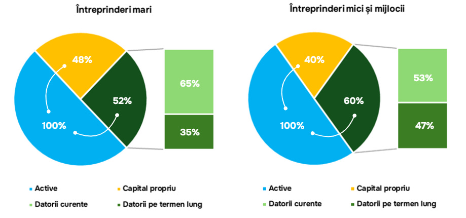 Analizând informațiile bilanțiere ale companiilor mari, în comparație cu cele ale întreprinderilor mici și mijlocii, se observă că datoriile curente reprezintă o pondere mai ridicată în structura totală a datoriilor pentru companiile mari — aproximativ 65%, față de 53% în cazul întreprinderilor mici și mijlocii. Această pondere de 65% este în scădere față de anii anteriori, în special în comparație cu anul 2021, când datoriile curente reprezentau 72% din totalul datoriilor. Datoriile curente sunt datorii pe termen scurt, ce se așteaptă să fie achitate sau decontate în termen de un an, e.g. datorii către furnizori, angajați, obligații fiscale. Având în vedere puterea de piață a companiilor mari, care în unele cazuri pot fi în poziție de monopson pe piața muncii, acestea pot să-și dezvolte activitatea într-o măsură mai mare pe datorii pe termen scurt.